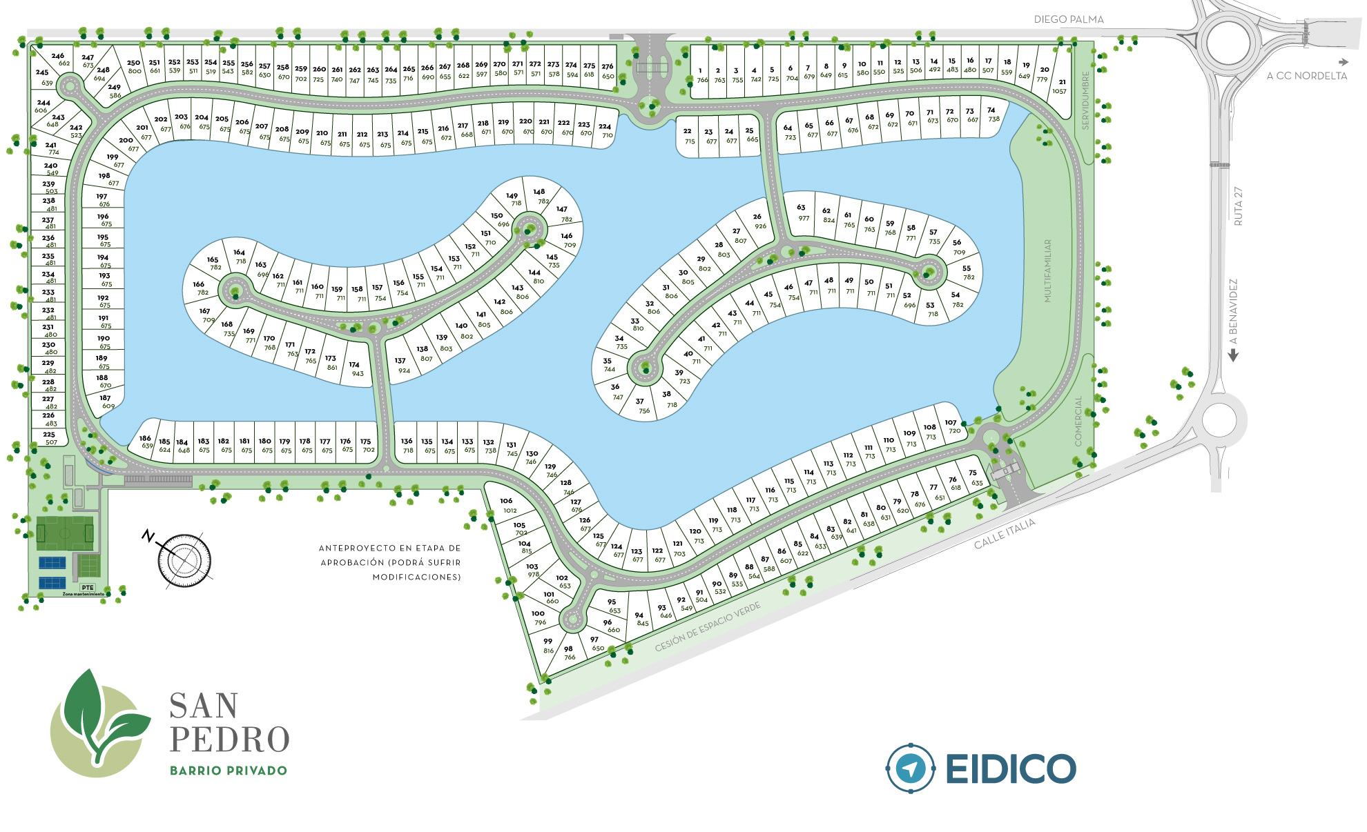 Su diseño de 276 lotes se proyecta en torno de una laguna de 14 ha, con islas y puentes.